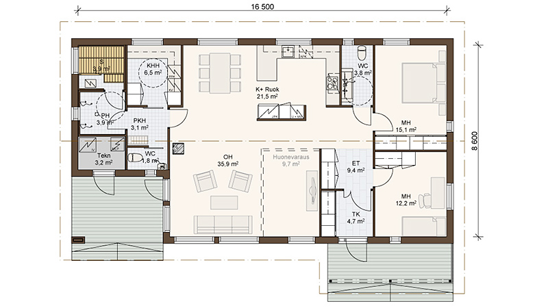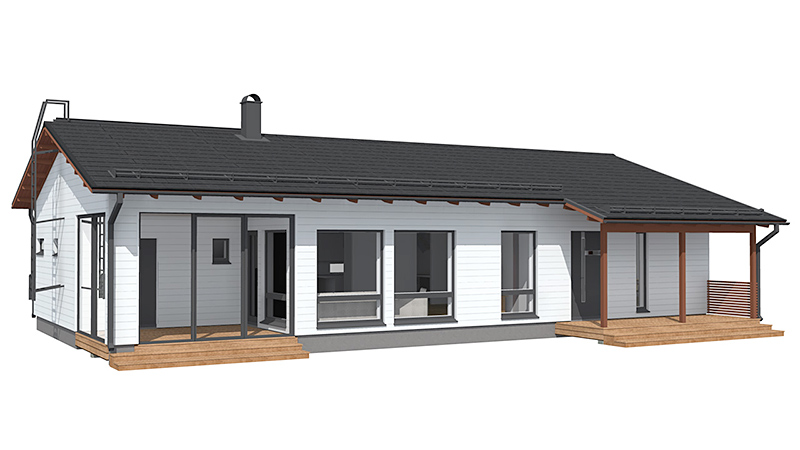Avaruudentuntua ja muunneltavuutta. Olohuoneesta pystytään tarvittaessa vaivattomasti jakamaan yksi asuinhuone lisää. Terassi voidaan helposti lasittaa tai muuttaa viherhuoneeksi.
