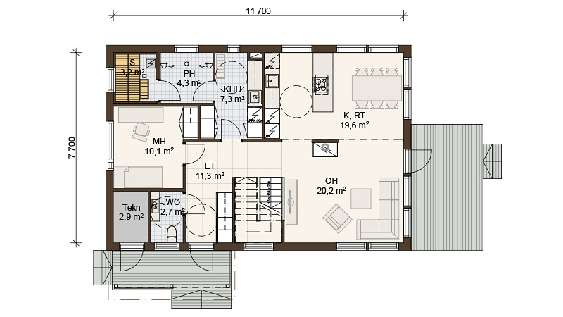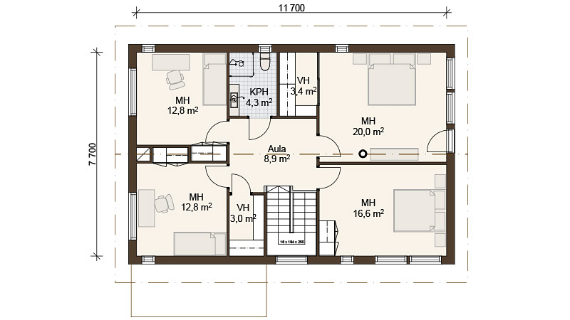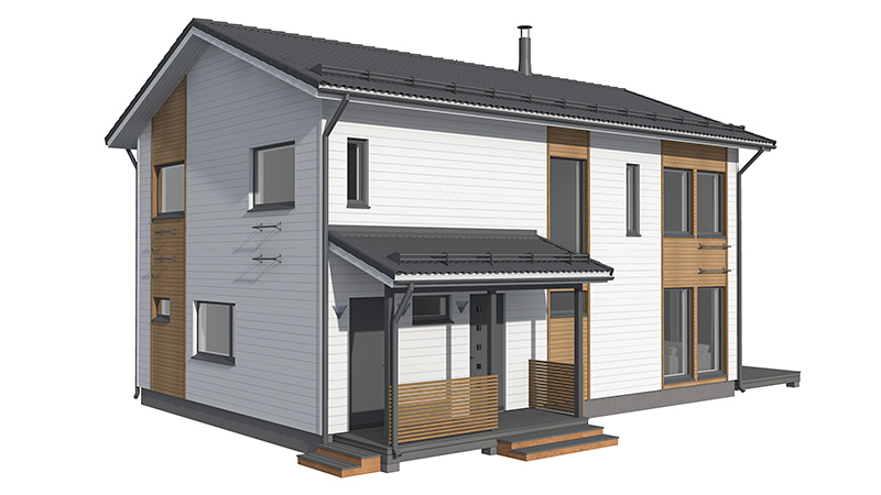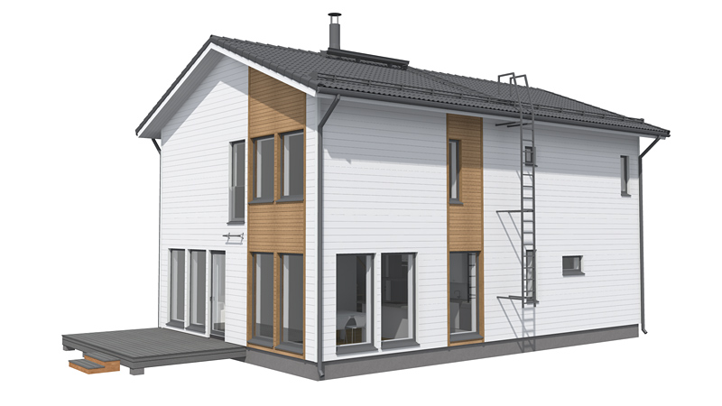 Tässä tyypilliseen kaupunkikaavaan sopeutuvassa talossa alakerran toimivuus hakee vertaistaan. Yläkerran huoneet ovat kookkaita ja monikäyttöisiä, ja eri puolilla taloa on runsaasti säilytystiloja monipuolisesti hyödynnettäväksi.