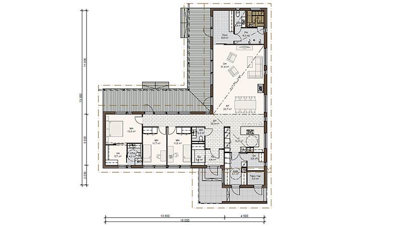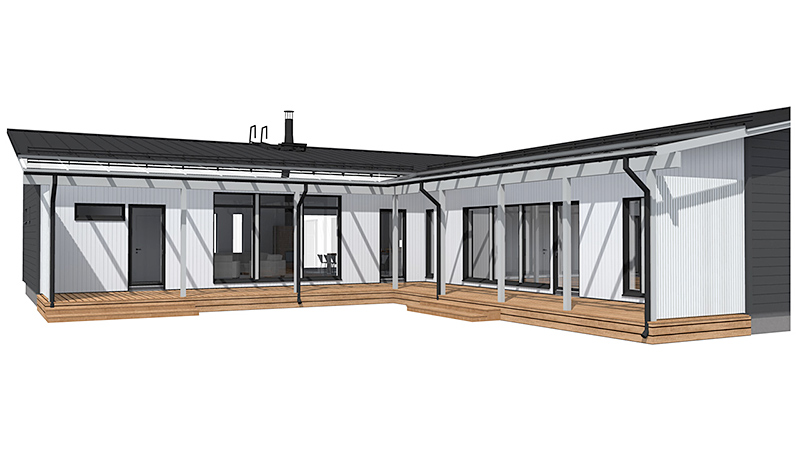 Tilava ja yksilöllinen ratkaisu perheelle, joka arvostaa sekä yhteistä aikaa että omaa rauhaa. Asumisen eri toiminnot on jaoteltu selkeästi omiin siipiinsä. Talomalli on muunnelma Tampereen asuntomessuille toteuttamastamme Estellestä.