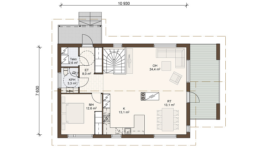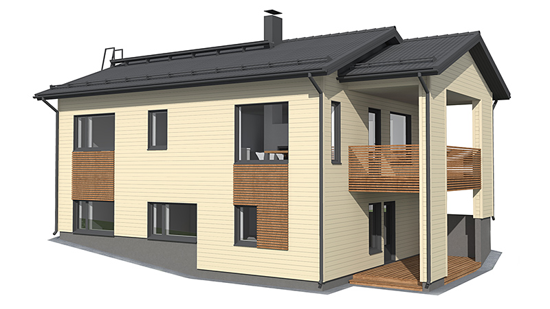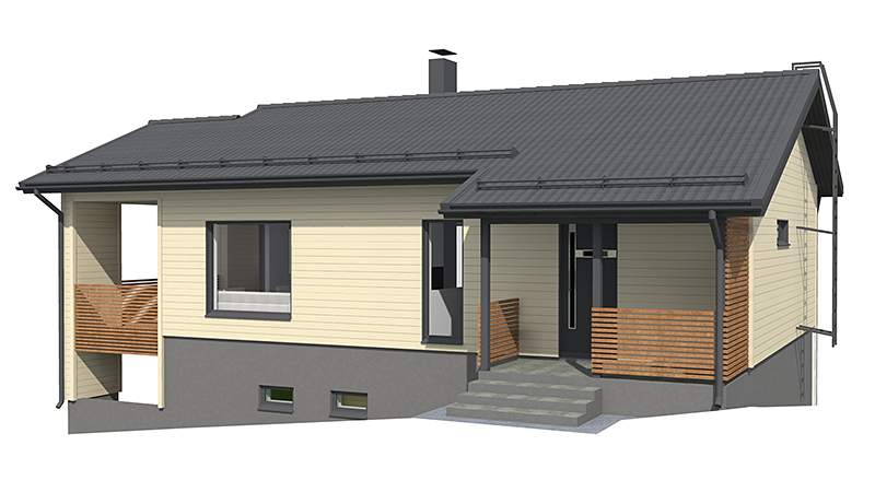 Pienehkö kellaritalo, joka soveltuu hyvin rinteeseen, jonka kallistumissuunta poikkeaa tontin tai kadun pituussuunnasta.