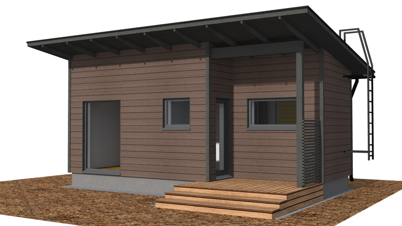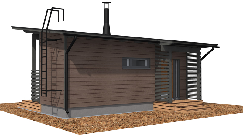 Rantasauna on suunniteltu vapaa-ajanasuntojen tonteille, joiden rakennusoikeus on 80+25 kerrosalaneliömetriä. Pääsisäänkäynti päädystä.